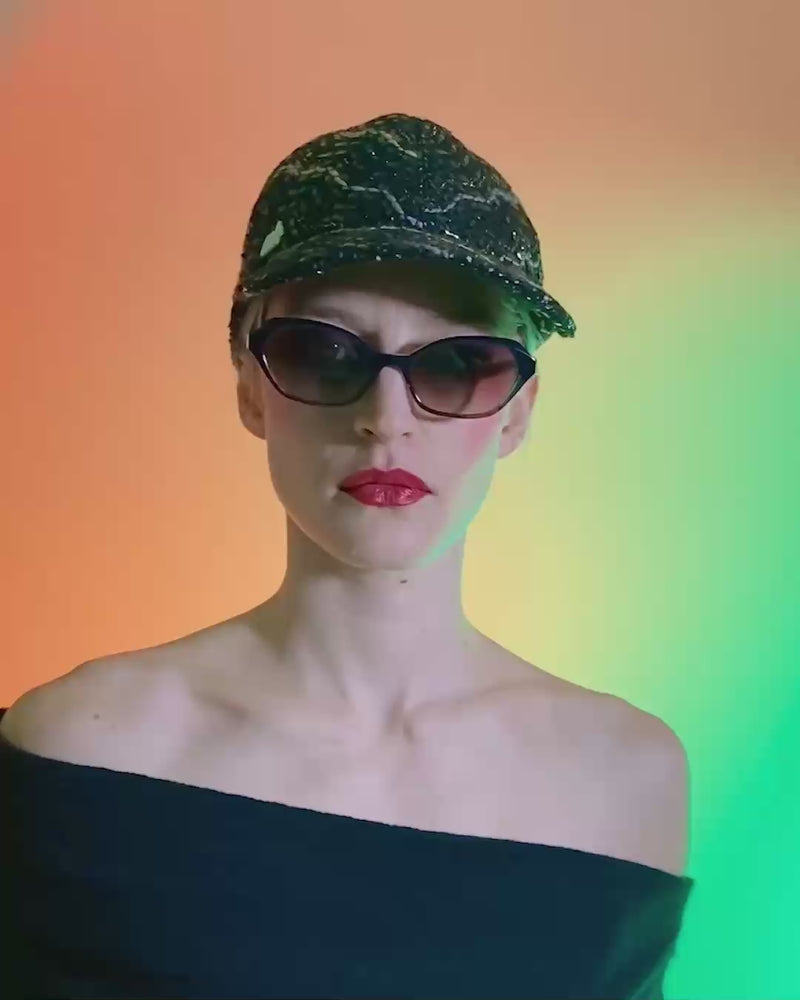 ブラックラメツイードのベースボールキャップ。MHロゴ付き。後ろ部分にゴムを使用しております。