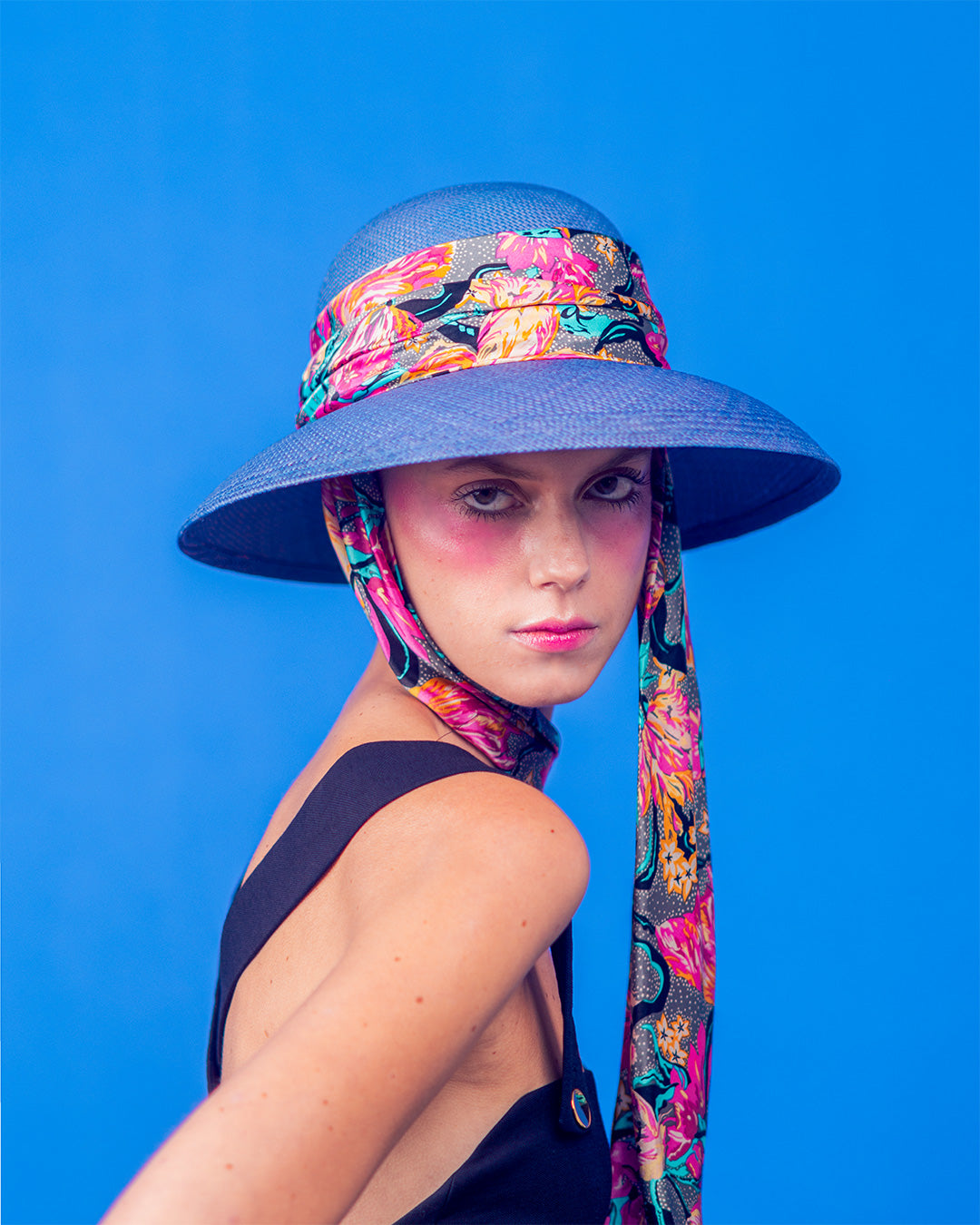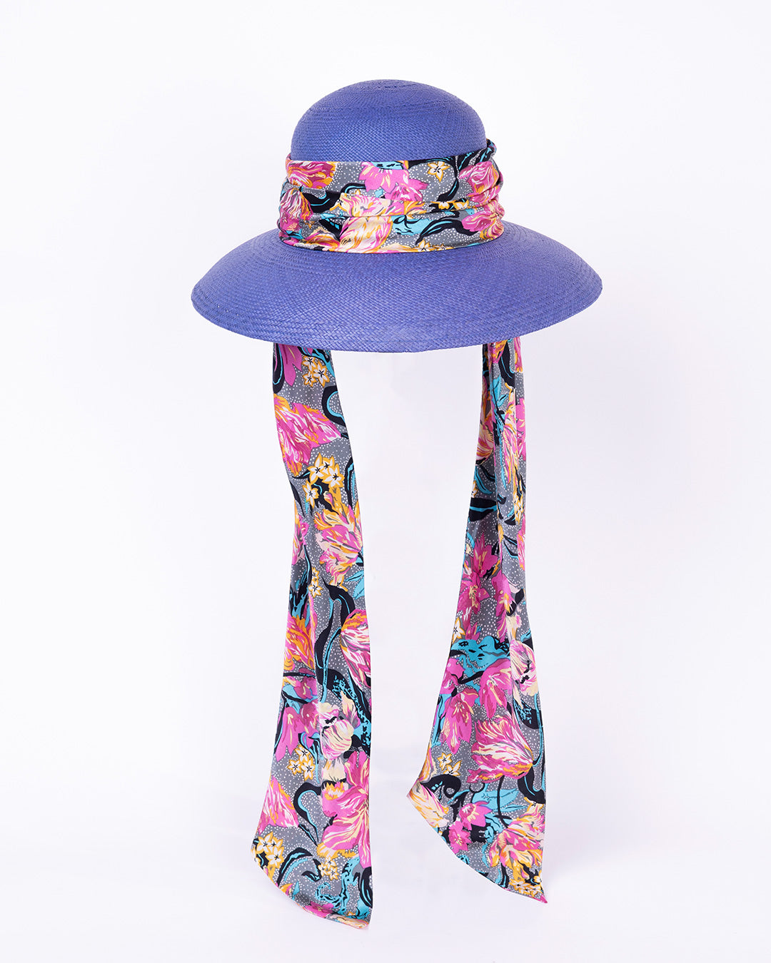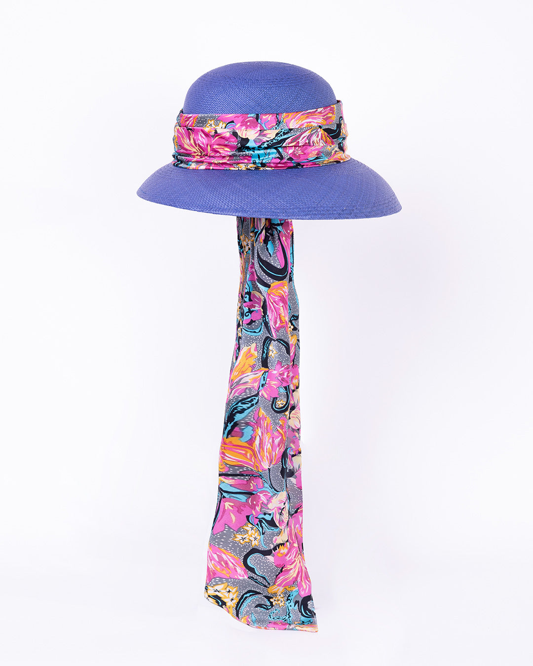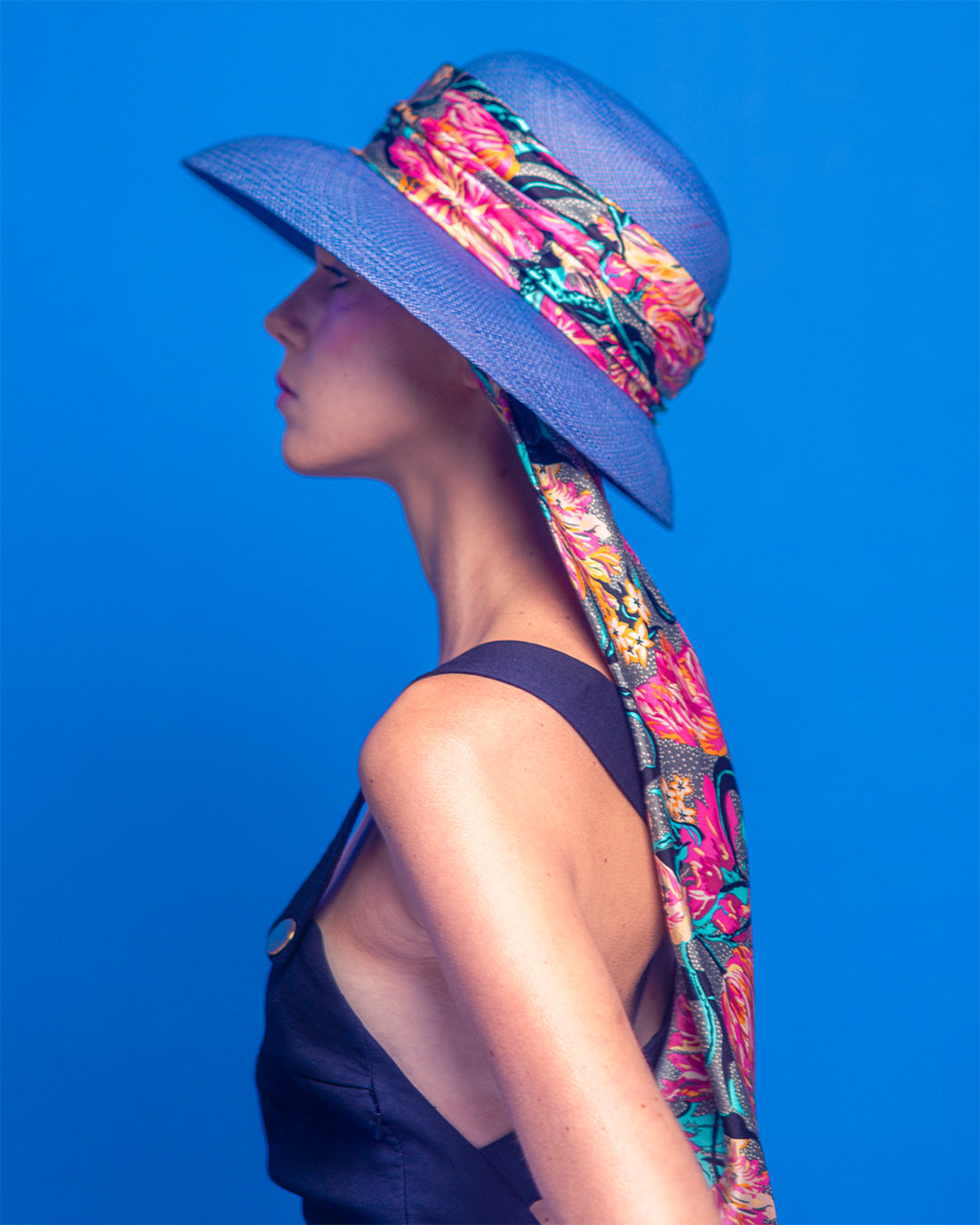深みのあるブルーのパナマで作られた、優美なワイドブリムのサマークロッシュ。クラウン部分はリバティシルクプリントのドレープで巧みに包まれ、カスケード状のシルクタイが動きと控えめなエレガンスを演出します。