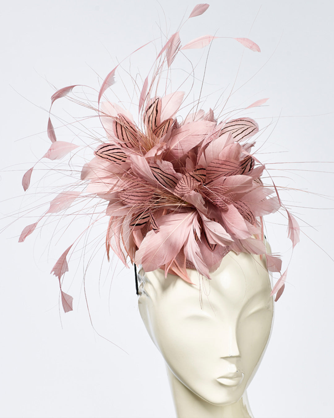 アンティークローズフェザーとロールオーガンジーの渦巻きをあしらった、カクテル・ヘッドドレス。装着しやすいカチューシャタイプです。