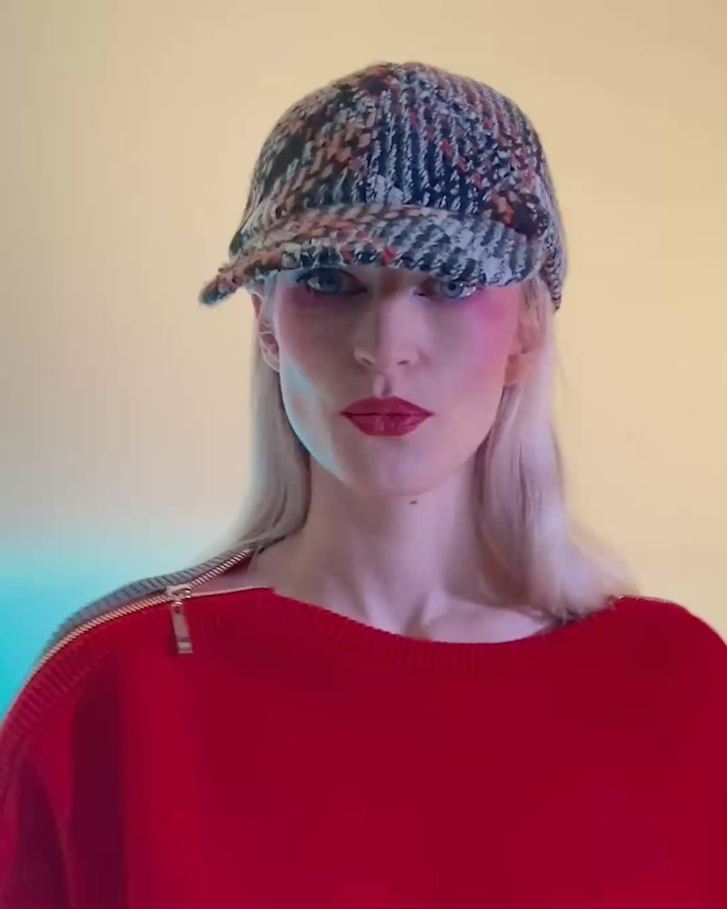 ブラックチェックツイードのベースボールキャップ。MHロゴ付き。後ろ部分にゴムを使用しております。