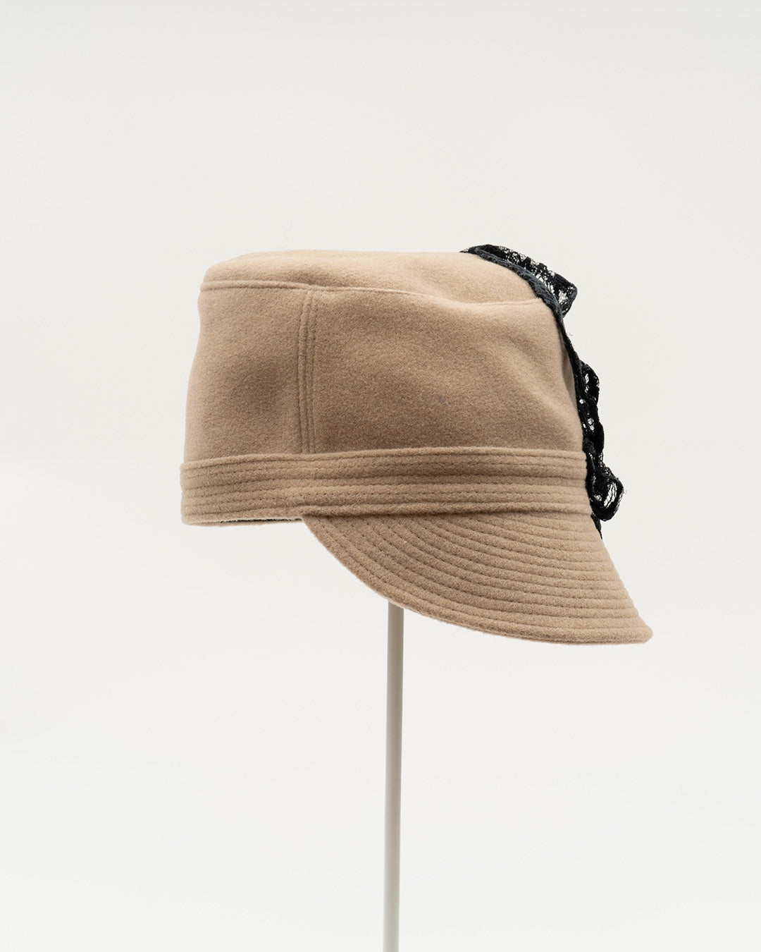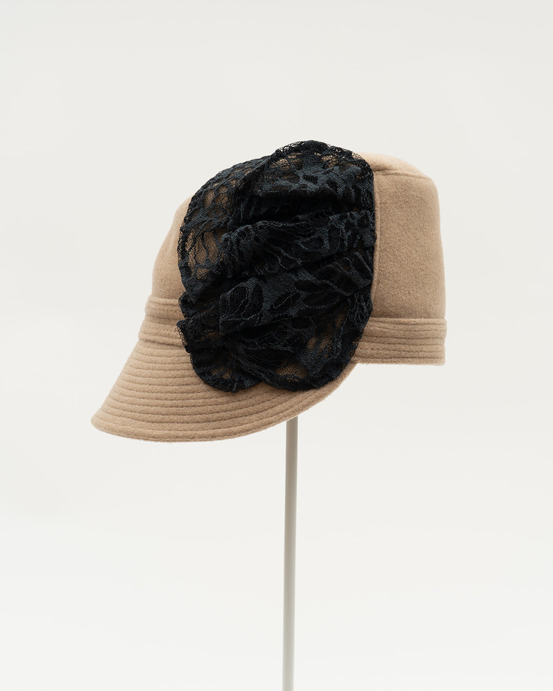 ブラックレースのフリルがあしらわれた、ベージュウールのキャップ。